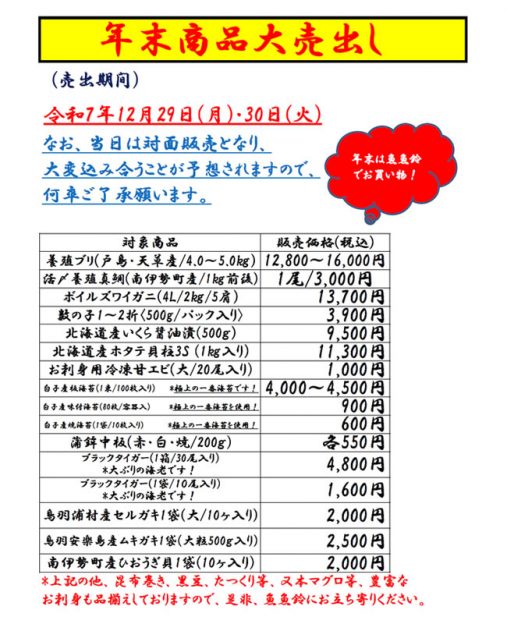 なお、令和7年12月29日(月)と12月30日(火)の2日間は対面販売とさせて頂きます。