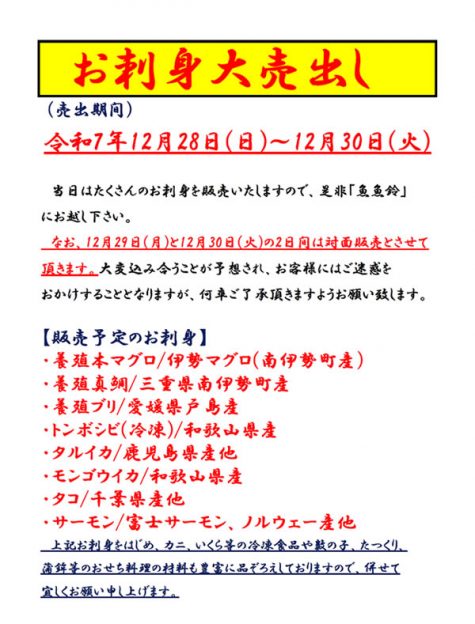 さて、魚魚鈴では「お刺身大売出し」を行います!